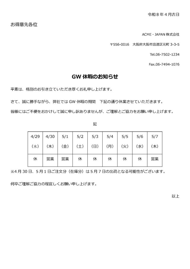 弊社は 4月29日および5月2日~6日まで の期間、GWのため休業とさせていただきます。